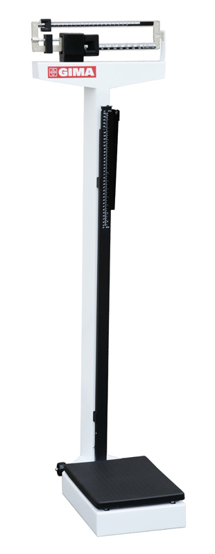 Balance traditionnelle avec système de levier robuste, plateau et colonne peints par pulvérisation et roulettes facilitant le transport.