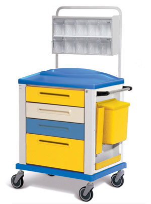 Chariot multifonctions usage de soins doté d'une structure en acier inoxydable, d'un revêtement externe en plastique et équipé d'un haricot, d'un plateau pour instruments et de tiroirs supérieurs. Fourni avec 4 tiroirs, un panier latéral et une table latérale supplémentaire. Quatre roulettes pivotantes en caoutchouc de Ø 125 mm.