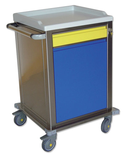 Chariot de soins modulaire en acier peint, structure autoportante et monobloc.