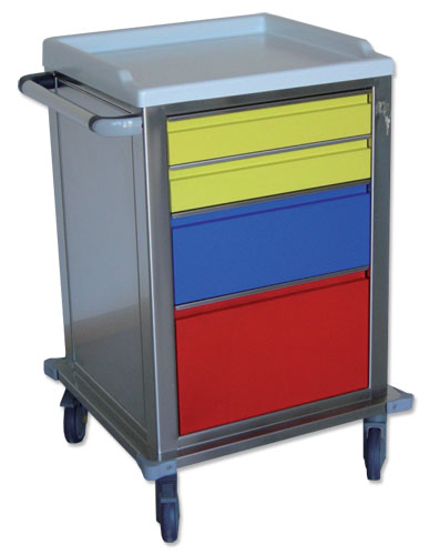 • Partie frontale aménagée avec plusieurs tiroirs (un jaune petit, un bleu moyen, un rouge grand), selon le modèle, avec panneaux revêtus de poudre époxy et poignée de maintien intégrée. Les coulissement des tiroirs se fait sur des glissières silencieuses, ils sont équipées aussi d'arrêts de course, avec possibilité de détacher le tiroir des glissières pour faciliter le nettoyage et la désinfection.