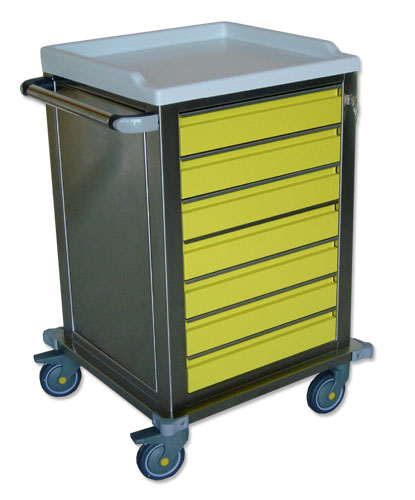 Chariot de soins modulaire en acier peint, structure autoportante et monobloc.