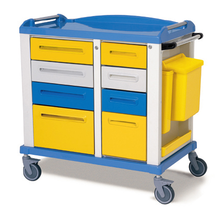 Chariot multifonctions usage de base doté d'une structure en acier inoxydable et d'un revêtement externe en plastique. Fourni avec 8 tiroirs, un panier latéral et une table latérale supplémentaire. Quatre roulettes pivotantes en caoutchouc de Ø 125 mm.
