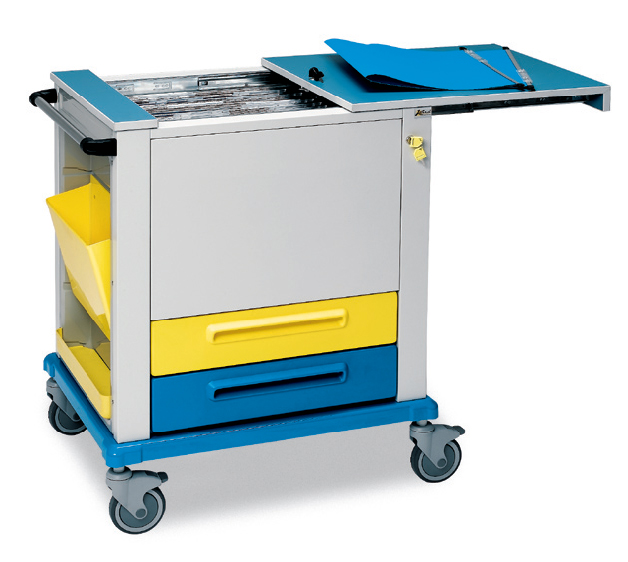 Ce chariot porte-dossiers est conçu pour accueillir les dossiers médicaux au format A3/A4 ou format spécifique. Structure en acier peint époxy, surface de travail et panneaux en plastique technopolymère. Doté de 4 roulettes pivotantes en caoutchouc de 125 mm de diamètre (2 avec frein). Tampons de protection sur le pourtour. Fabriqué en Italie. Contient 25 porte-dossiers (non fournis).