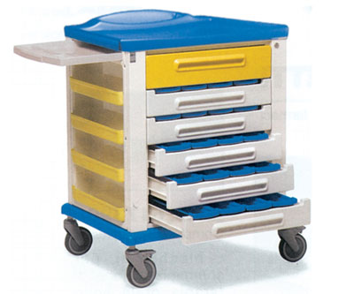 Chariot porte-médicaments à la structure solide. Il est robuste grâce à l’utilisation de composants en plastique (technopolymère) et lame d’acier vernie aux poussières époxy afin d’obtenir une meilleure légèreté, manœuvrabilité et praticité d’utilisation.