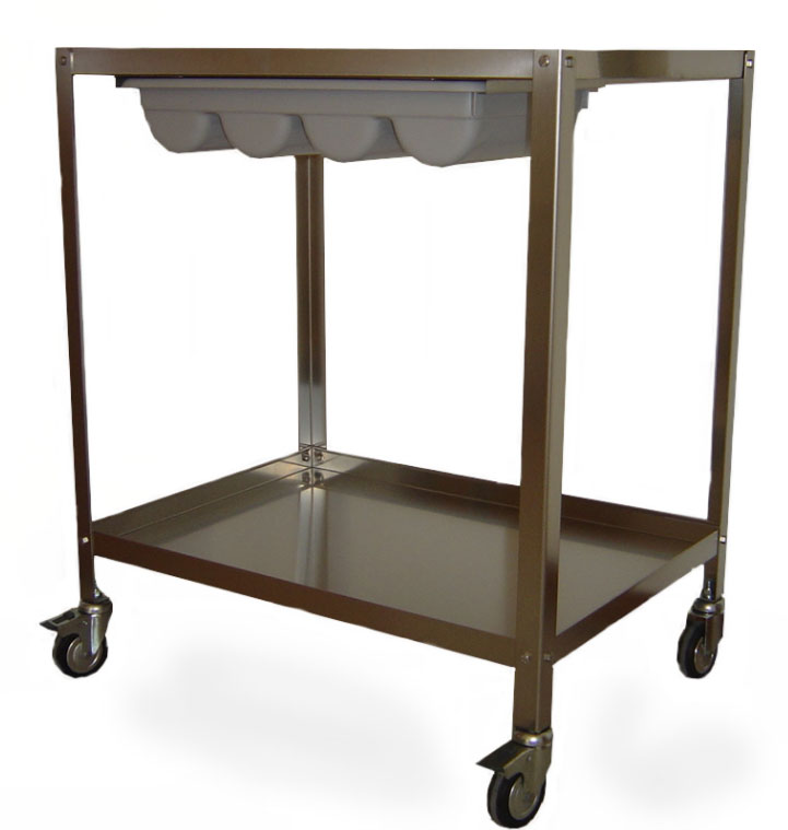 Chariot en acier inoxydable AISI 304 avec tiroir en plastique composé de 4 compartiments internes, 2 tablettes à rebord (3,5 cm) de chaque côté, roulettes pivotantes en caoutchouc (Ø 80 mm - deux avec frein).