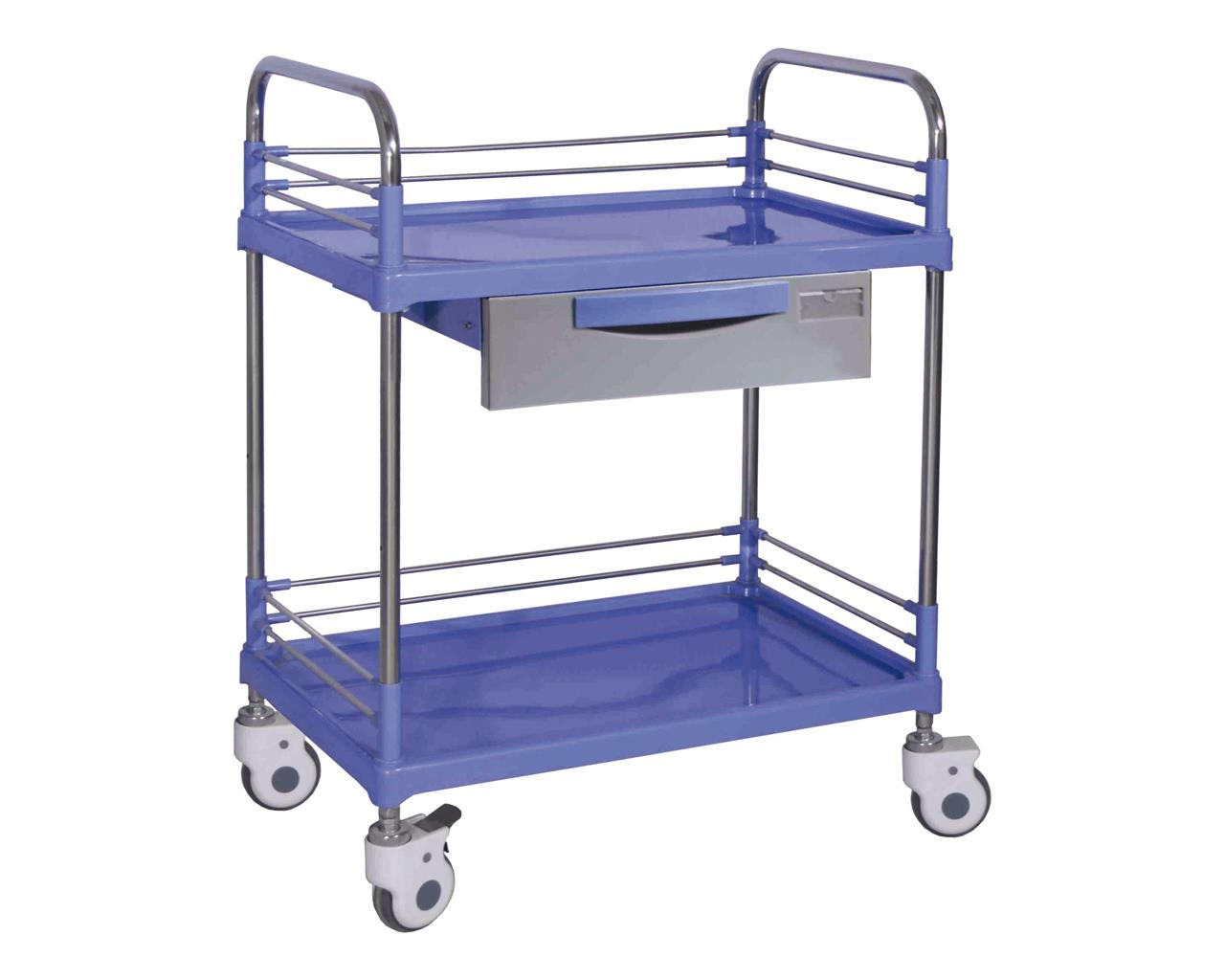 Pratique chariot en acier inox, avec un tiroir et deux tablettes en ABS de haute qualité, pourvues de rebord latéral en acier inox sur trois côtés pour éviter la chute des objets. Deux poignées de manoeuvre facilitent le déplacement.