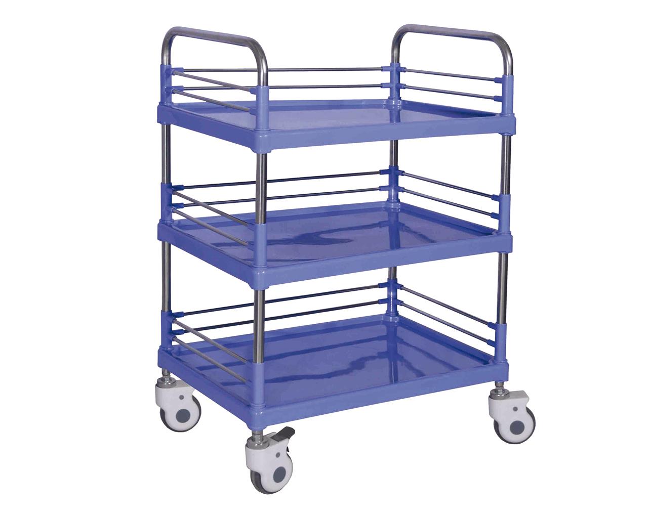 Pratique chariot en acier inox, avec trois tablettes en ABS de haute qualité, pourvues de rebord latéral en acier inox sur trois côtés pour éviter la chute des objets. Deux poignées de manoeuvre facilitent le déplacement.
