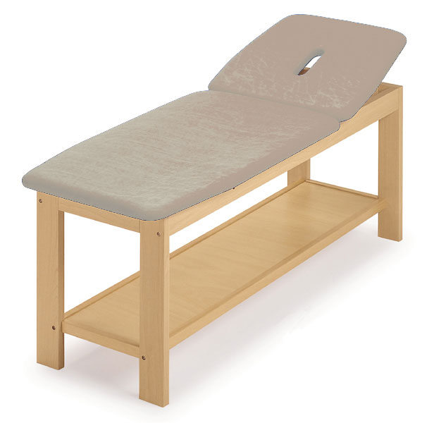 Table d’examen pour traitements avec une solide structure en bois à section réglable: section dossier avec système de réglage manuel, et une section fixe.