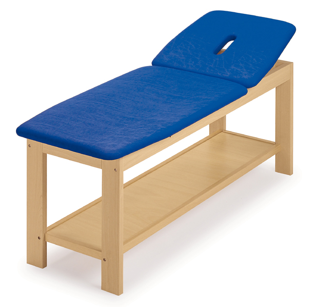 Table d’examen pour traitements avec une solide structure en bois à section réglable: section dossier avec système de réglage manuel, et une section fixe.