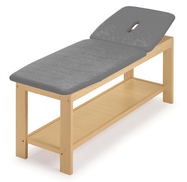 Table d’examen pour traitements avec une solide structure en bois à section réglable: section dossier avec système de réglage manuel, et une section fixe.