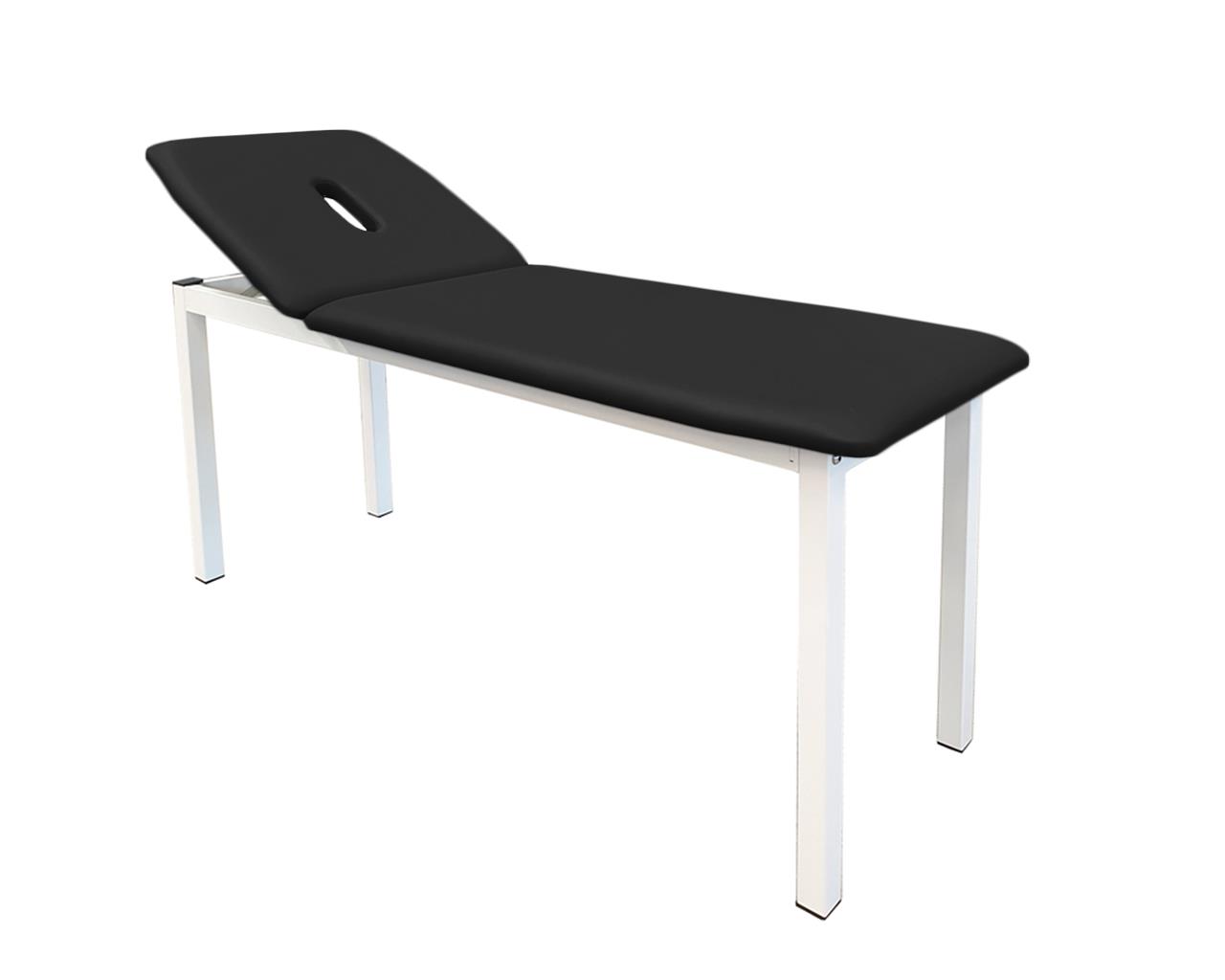Table d'examen et pour traitements au design avancé conçue pour des usages esthétiques et médicaux. Équipée d'une structure métallique démontable et d'une section réglable par mouvement manuel pour faciliter les opérations sur le patient. La tête est équipée d'un large ouverture bouche-nez (ouverture faciale) pour une position ventrale.