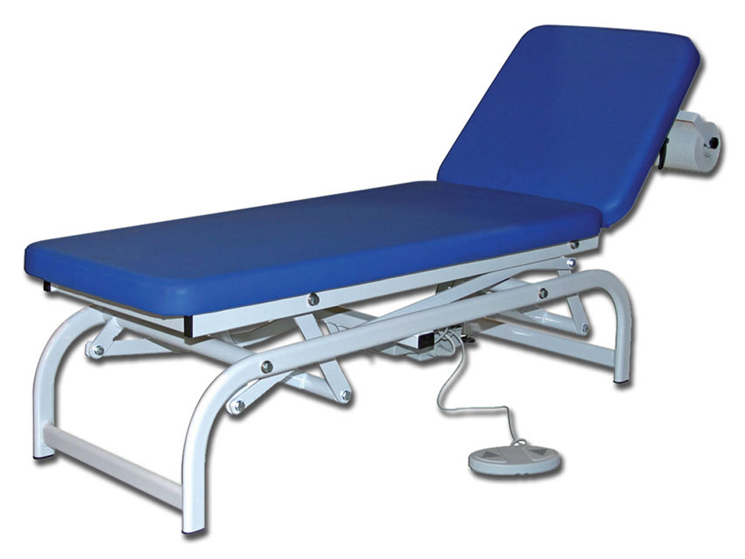 Divan d’examen réglable en hauteur par interrupteur électrique au pied, section de tête aisément réglable par système mécanique.