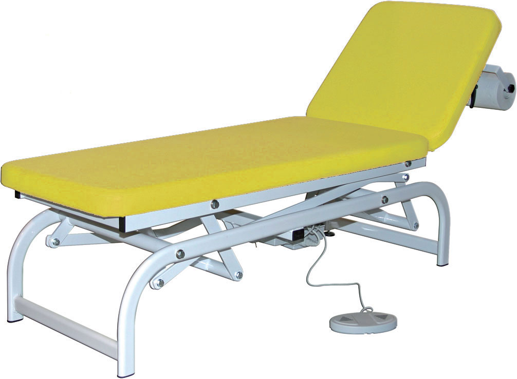 Divan d’examen réglable en hauteur par interrupteur électrique au pied, section de tête aisément réglable par système mécanique.