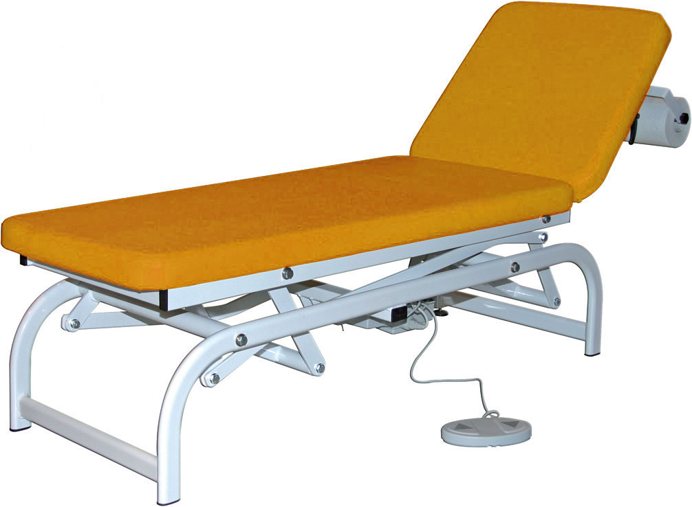 Divan d’examen réglable en hauteur par interrupteur électrique au pied, section de tête aisément réglable par système mécanique.