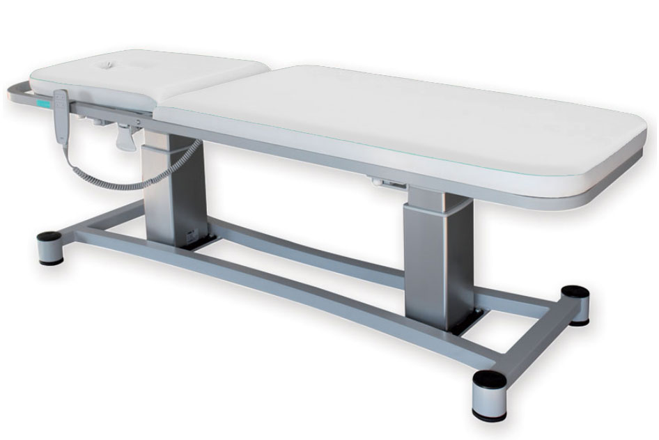 Réglable en hauteur grâce à deux colonnes électriques qui peuvent bouger en même temps ou séparément (pour permettre les positions Trendelenburg et Trendelenburg inverse) grâce une commande à bouton.