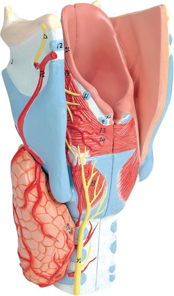 Ce modèle en 5 pièces est sectionné longitudinalement afin de mettre en évidence les détails les plus précis des structures internes, en particulier l'os hyoïde, les cartilages, les ligaments, les vaisseaux sanguins, les nerfs et la thyroïde.