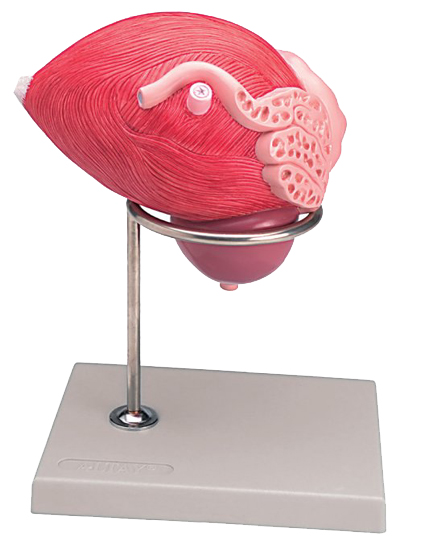 Le produit est sectionné le long de la ligne médiane pour montrer à la fois les structures internes et externes de la vessie et de la prostate. Il comprend les orifices urétrique et urétal, le conduit déférent, la glande séminale et le canal éjaculateur.