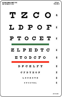 Échelle optométrique Snellen pour acuité visuelle avec barre couleurs.
