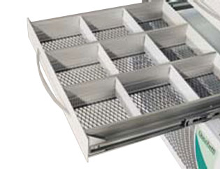 Tiroir coulissant en aluminium atoxique à sortie totale sur glissières télescopiques réglables en hauteur, équipé de séparateurs en acier plastifié atoxique à réglage micrométrique (max. 05 sans tablettes grillagées - 5+5 pour le modèle 2T), adapté aux réfrigérateurs Fiocchetti modèles 140 et 280.