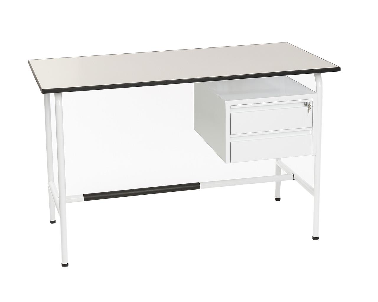 Bureau avec 2 tiroirs latéraux et tiroir supérieur verrouillable, structure en acier tubulaire émaillé.
