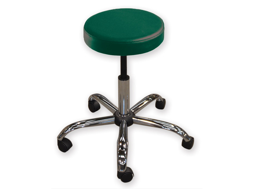 Tabouret en acier inoxydable avec assise en similcuir rembourrée ignifuge. Hauteur régable: 50-60 cm.