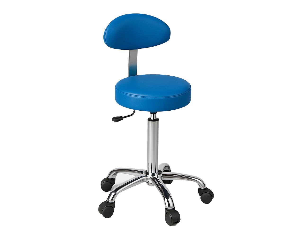 Tabouret en acier avec assise et dossier embourrés de diamètre 34 cm et roulettes. Réglable en hauteur.