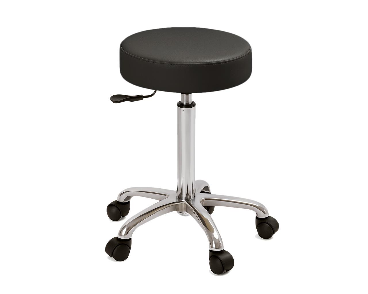 Tabouret en acier inoxydable avec assise en similcuir rembourrée. Hauteur réglable.