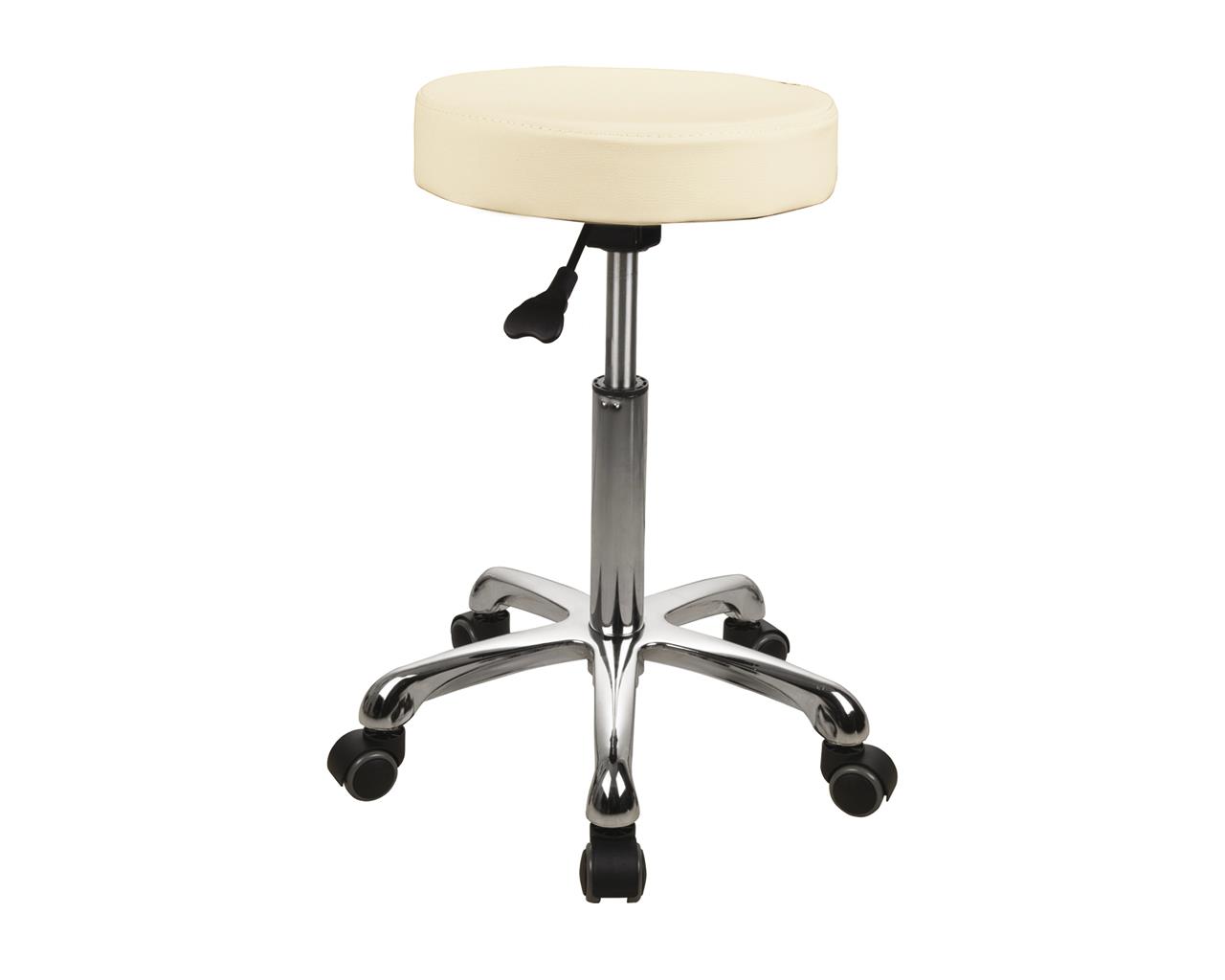 Tabouret en acier inoxydable avec assise en similcuir rembourrée. Hauteur réglable.