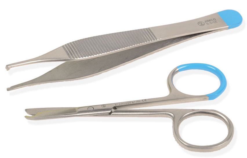 SUTURE PROCEDURE PACK • Spencer ligature scissors - straight - 9 cm • Adson tissue forceps toothed - 12 cm Boîte de 25 poches. Une gamme complète d'instruments jetables réalisée pour garantir aux utilisateurs une bonne qualité et un matériau métallique solide alternatif par rapport aux instruments jetables en plastique. Chaque produit présente une partie en bleu pour en empêcher la confusion avec les instruments réutilisables. Conditionnement individuel dans une poche stérile. Stérilisation aux rayons gamma.