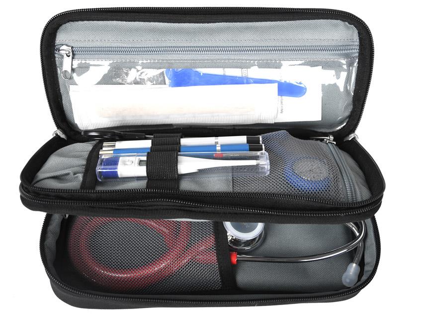 Trousse souple multi-usage, équipée d'un séparateur interne qui divise la trousse en deux compartiments. Le compartiment inférieur pour le stéthoscope et le compartiment supérieur pour les accessoires infirmiers.