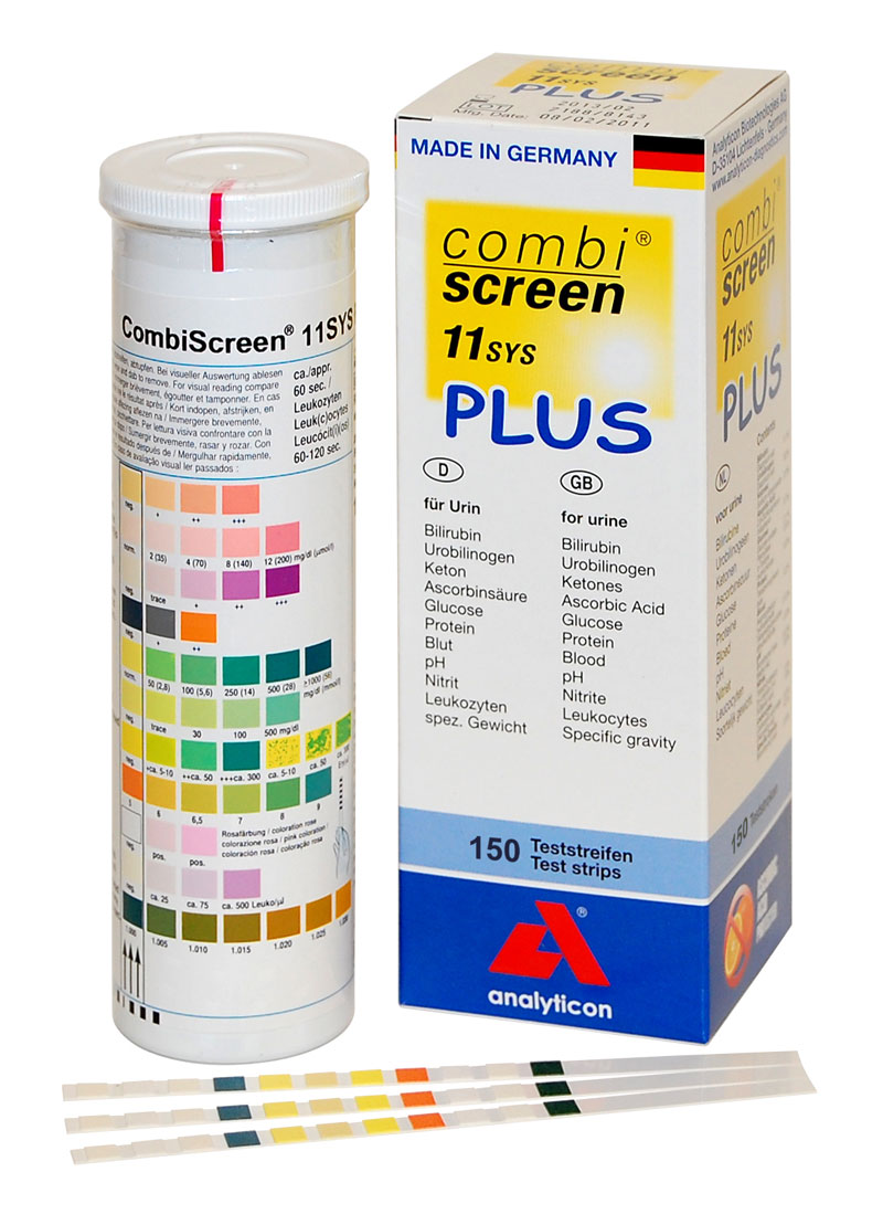 Bandelettes urinaires ANALYTICON COMBI SCREEN SYS PLUS permettant l'évaluation de 11 paramètres.