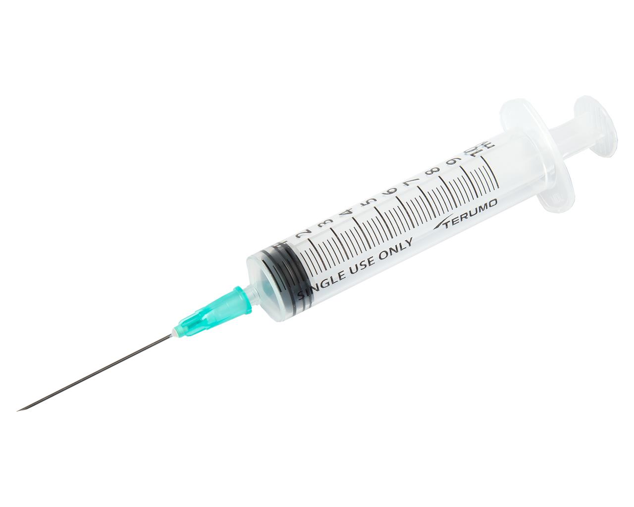 Seringues stériles à usage unique 3 pièces Terumo, avec aiguille préconnectée. Les seringues sont destinées à l’aspiration ou à l’injection de sang ou de liquides dans le corps humain.