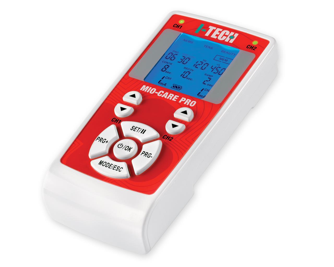 Stimulateur TENS Mio-Care PRO à 2 canaux avec 63 programmes (14 médicaux + 15 bien-être + 21 fitness + 13 personnalisables).
