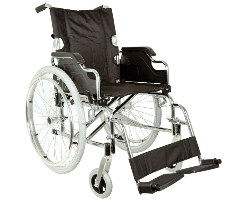 Fauteuil roulant pliant Royal, assise 46 cm, tissu noir, structure à double croisement, structure en acier chromé, accoudoirs relevables en PU, repose-pied amovibles, plateau relevable avec ceinture pour jambes, roues arrière pneumatiques 61 cm, avec système à démontage rapide, roulettes avant pleines 15 cm, freins sur roues arrière, dossier pliable, large poche arrière.