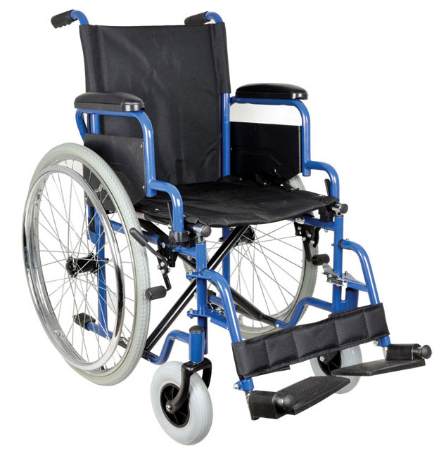 Fauteuil roulant en tissu noir, structure de soutien de l’assise simple, châssis en acier laqué par poudre bleue, fourche avant en acier laqué par poudre, roues avant pleines en PU, roues arrière à bandage à détachement rapide avec freins de blocage, accoudoirs rembourrés et escamotables, palettes repose-pieds extractibles, potence repose-pieds escamotable avec bande, pliable.
