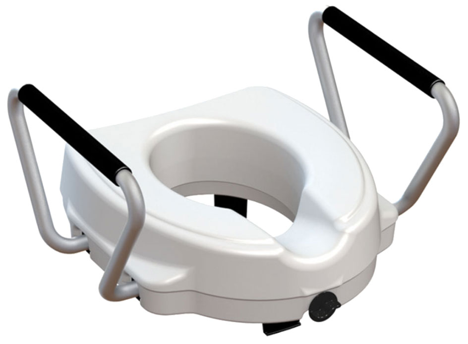 Réhausseur toilette avec système de fixation à vis frontale et accoudoirs fixes en aluminium anodisé.