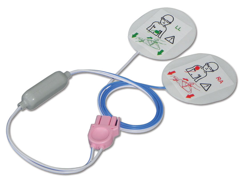 Électrodes pédiatriques jetables pour défibrillateurs Medtronic-Physiocontrol. Ces électrodes intègrent un système de réduction d’énergie de 200 J à 50 J.
