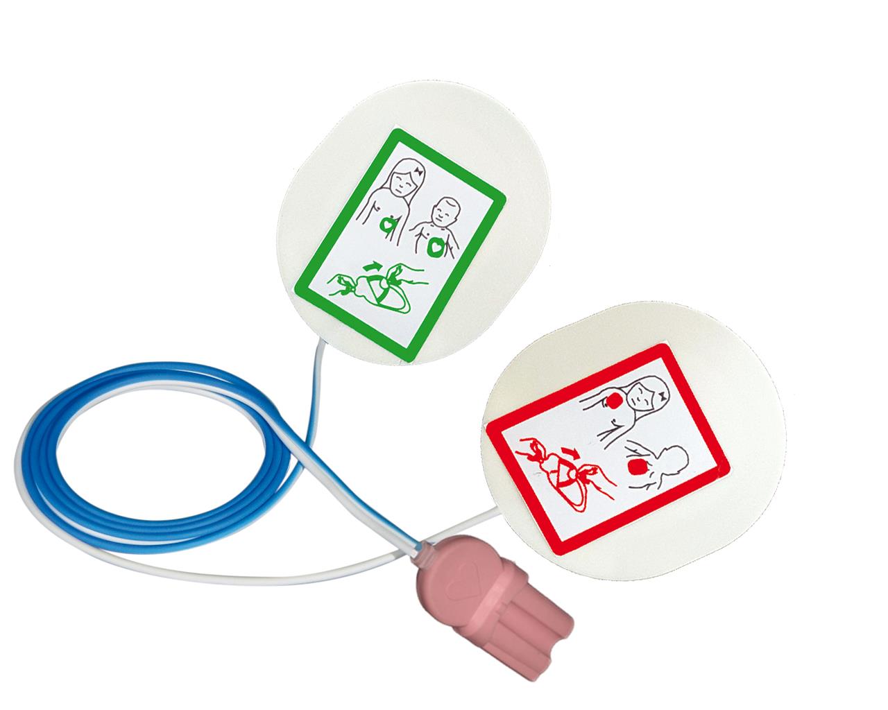 Électrodes pédiatriques jetables compatibles pour défibrillateurs Philips Laerdal Medical. Ces électrodes disposent d’un système de réduction d’énergie de 200 J à 50 J.