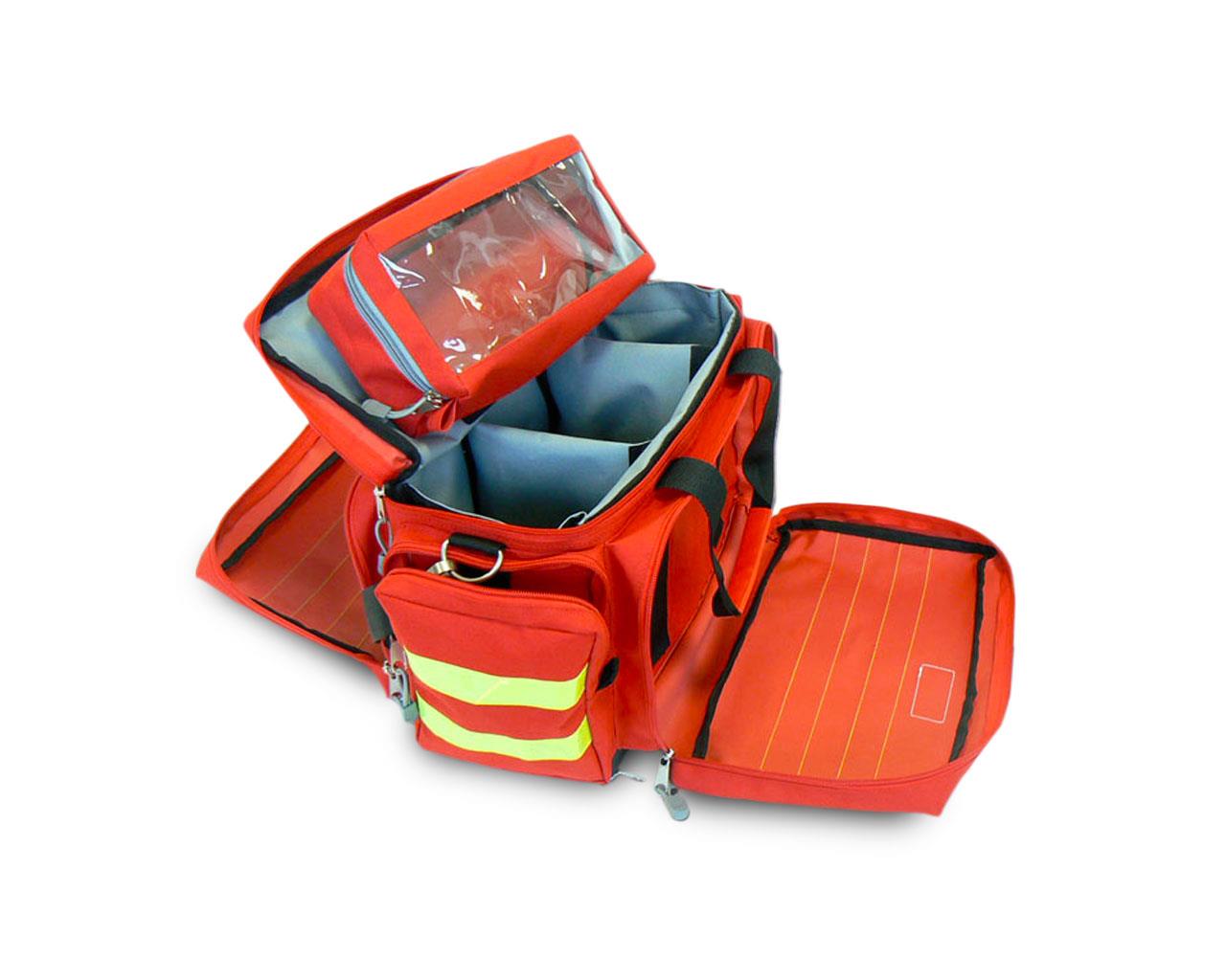 Sacs de secours professionnels, de grande contenance avec compartiments internes réglables permettant une organisation personnalisée de l'espace. Dotés de poches externes, séparations internes, et une pochette amovible à fenêtre transparente. Fabriqué en tissu Cordura imperméable et résistant doté de doubles bandes réfléchissantes jaunes. Revêtement intérieur amovible pour un nettoyage simplifié. Fond imperméable en caoutchouc pour empêcher les infiltrations d'eau. Possibilité de transport sur le dos ou à la main.