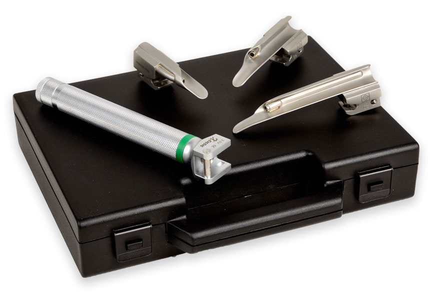 Laryngoscope gamme Gima Green Maxlite avec fibre optique intégrée et lumière halogène xénon.