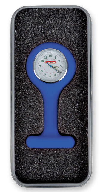 Montre pour infirmiers en silicone, ronde, avec épingle de sécurité et étui en aluminium. Utiles pour détecter le battement et le pouls du patient ainsi que pour mesurer la durée de stérilisation des outils. Conformes aux normes actuelles qui interdisent aux infirmiers de porter une montre-bracelet.